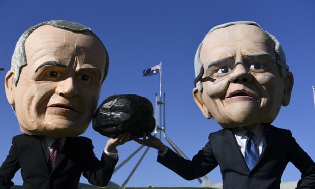 Protesters against the Adani coalmine dressed as Bill Shorten and Scott Morrison. A poll has found 40% of voters are unsure which party has the best energy policy. Photograph: Lukas Coch/EPA