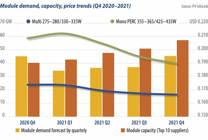 Driven by postponed projects, as well as China’s June 30 installation rush, strong demand is likely to persist from the second half of 2020 to the first half of this year. Meanwhile, prices for modules and their components have remained high due to strong demand ahead of the Lunar New Year holiday. But these will begin to decline rapidly in the second quarter, when new glass capacity comes online, cell prices slip, and overseas customers are in “wait-and-see” mode.