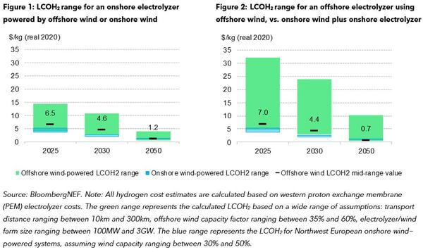 BloombergNEF estimates the mid-range LCOH2 to be about $4.6/kg in 2030 for an offshore wind project with an onshore electrolyzer. Costs however vary significantly by site and project size. They are also falling: the mid-range LCOH2 falls to around $1.0/kg by 2050 as both offshore wind projects and electrolyzers get cheaper. By then, it is cheaper to use offshore rather than onshore wind to produce hydrogen. Non-economic factors, such as H2 consumption mandates, or government subsidies will be key to uptake in the meantime.
