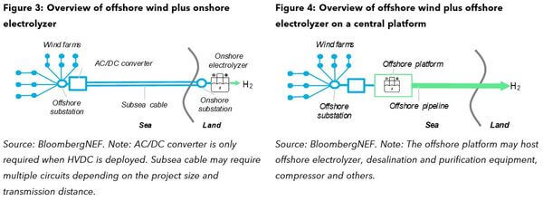 Offshore wind plus onshore electrolyzer. Electricity is transmitted via a subsea cable to an onshore electrolyzer to produce hydrogen (Figure 3).