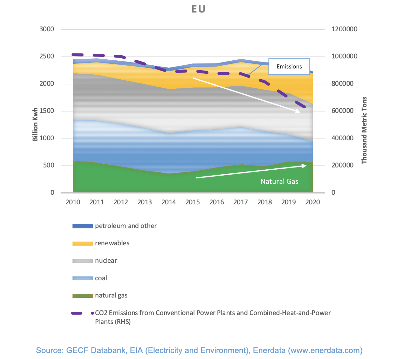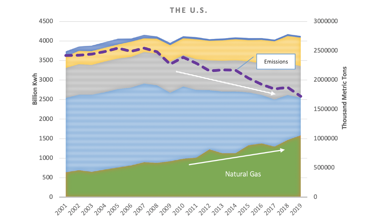 There is evidence that the countries that increased the share of natural gas in their power generation mix have significantly mitigated the sector's CO2 emission level. Figure (2) illustrates the share of different energy sources in the U.S. power generation mix and the level of power sector CO2 emissions from 2001. As is evident on the graph, natural gas’s contribution in the U.S. power generation mix increased from 639 billion kilowatt-hours in 2001 to 1,617 billion kilowatt-hours in 2019. At the same time, the power sector's emissions declined from 2,418,607 to 1,724,396 thousand metric tonnes in 2019. Thus, lower CO2 emissions in the U.S. power sector is mainly attributed to replacing coal with natural gas over the past 20 years.