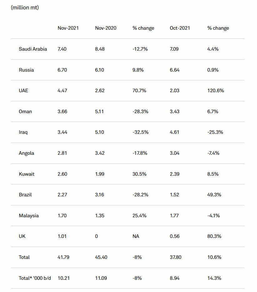 In January-November, China's crude imports from the UAE stood at 28.21 million mt, or 619,000 b/d, declining 7.3% year on year in line with the country's total crude inflow volume, GAC data showed.