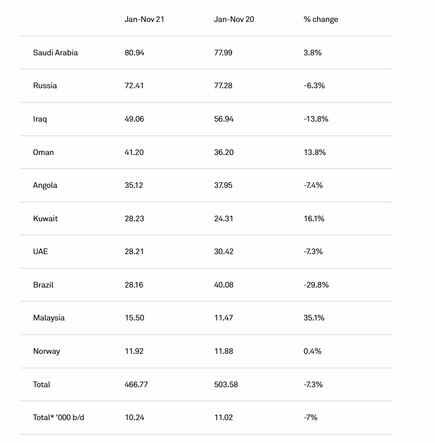 Thanks to the year-on-year increases contributed by Saudi Arabia, Oman and Kuwait, China's crude imports from the Middle East edged down 0.7% on the year in the first 11 months to 235.54 million mt, or 5.17 million b/d, to account for a 50.5% market share.