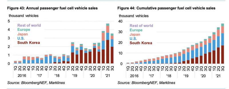 The grand total of FCEV? Less than 38,000. Just 3,500 were sold in the third quarter of 2021, more than half in South Korea where the likes of Hyundai have made a big bet on FCEVs. More than 1.7 million full battery electric vehicles were sold in the same quarter.