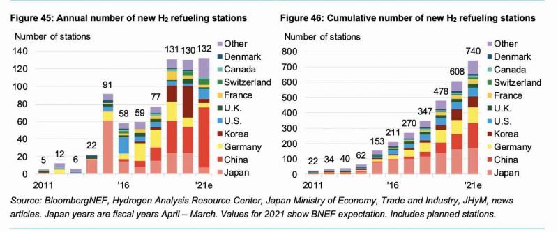 According to BloombergNEF, just 132 new H2 refueling stations were added across the world in 2021, half of those in China, taking the global grand total to 740.