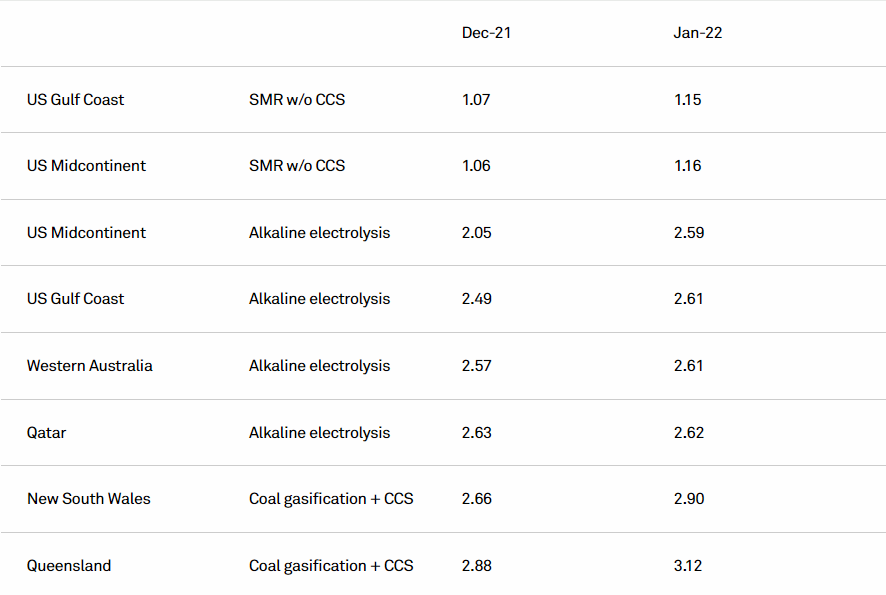 The infographic, which will be updated monthly, shows the lowest cost region for hydrogen production (via conventional steam methane reforming without carbon capture and storage, or CCS) was the US Gulf Coast at just $1.15/kg.