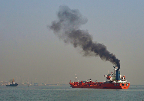 Ship coming in to the Port of Mumbai, India, emits a plume of black diesel smoke. February 27, 2018 (Photo by Cyprien Hauser)