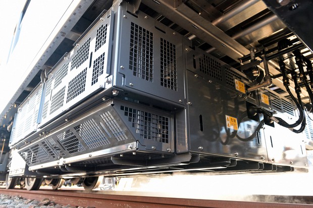 Fuel cells are seen under the floor of test train car "Hybari" in the Kanagawa Prefecture city of Kawasaki's Nakahara Ward on Feb. 18, 2022. (Mainichi/Takehiko Onishi)KAWASAKI, Kanagawa -- Japan's first test train car capable of running while generating power using hydrogen was unveiled to reporters in this city south of Tokyo by the East Japan Railway Co. (JR East) on Feb. 18.