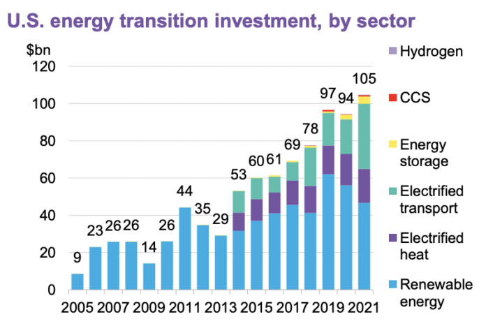 The U.S. now invests around $200 million per year in hydrogen, which is double the spend from 2020. Investment tied to electric vehicles reached $35 billion.