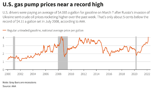 U.S. gasoline prices at the pump edged lower over the weekend after reaching all-time highs last week following Russia's invasion of Ukraine.