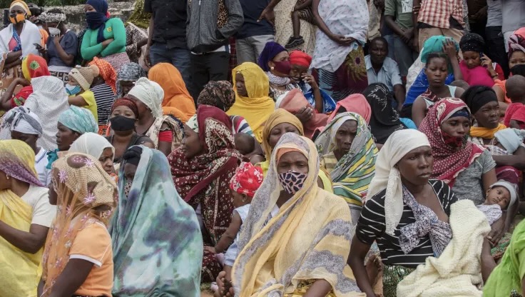 Pemba, Mozambique - Families wait outside the port of Pemba on April 1, 2021, for the boat of evacuees from the coasts of Palma. More than a thousand people evacuated from the shores of the town of Palma arrived at the sea port of Pemba after insurgents attacked Palma on March 24, 2021.