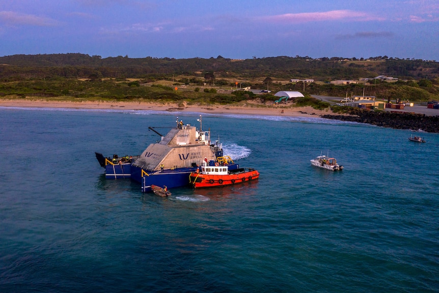 It was towed across last year to King Island and placed in the rough waves off Grassy Harbour.
