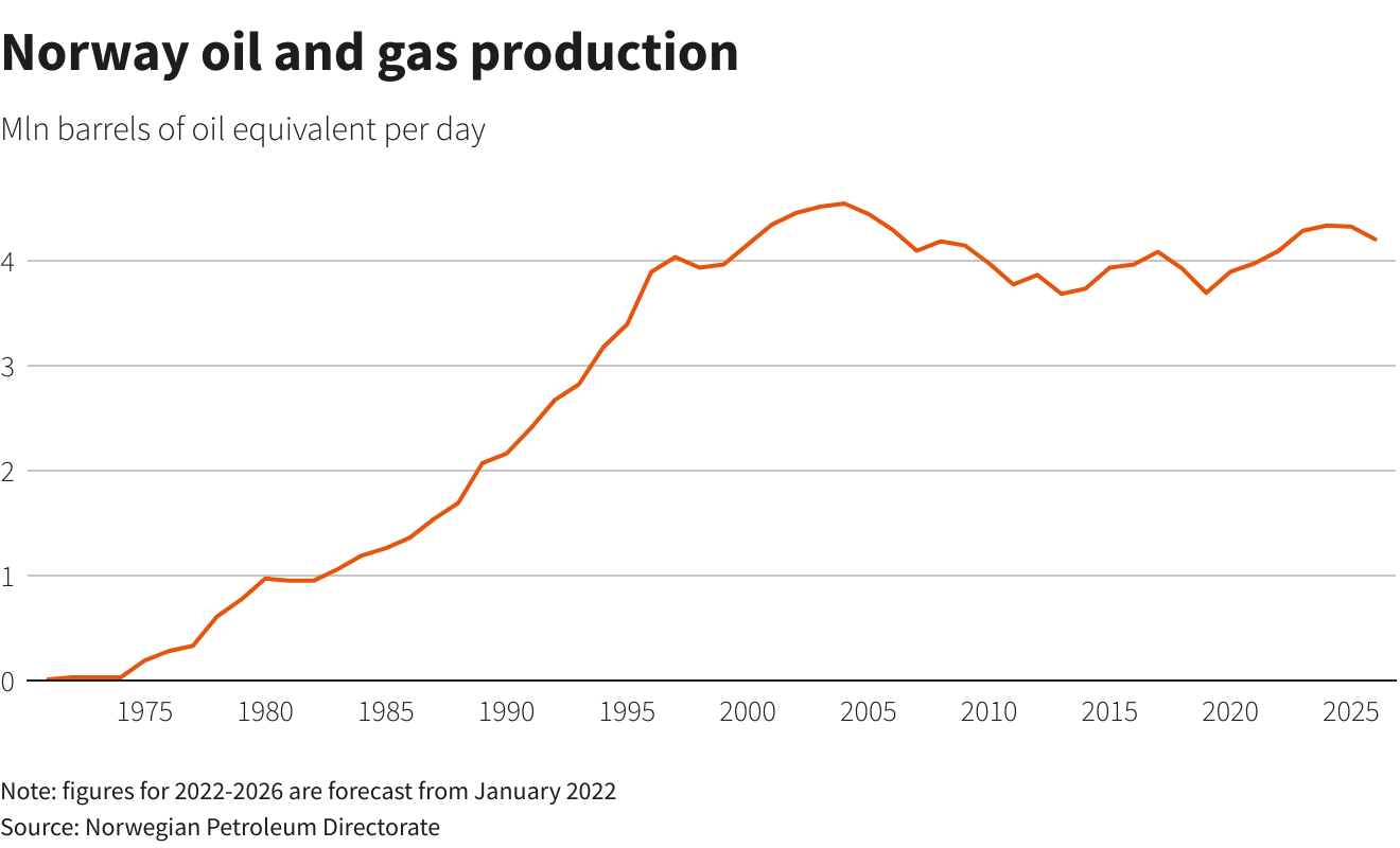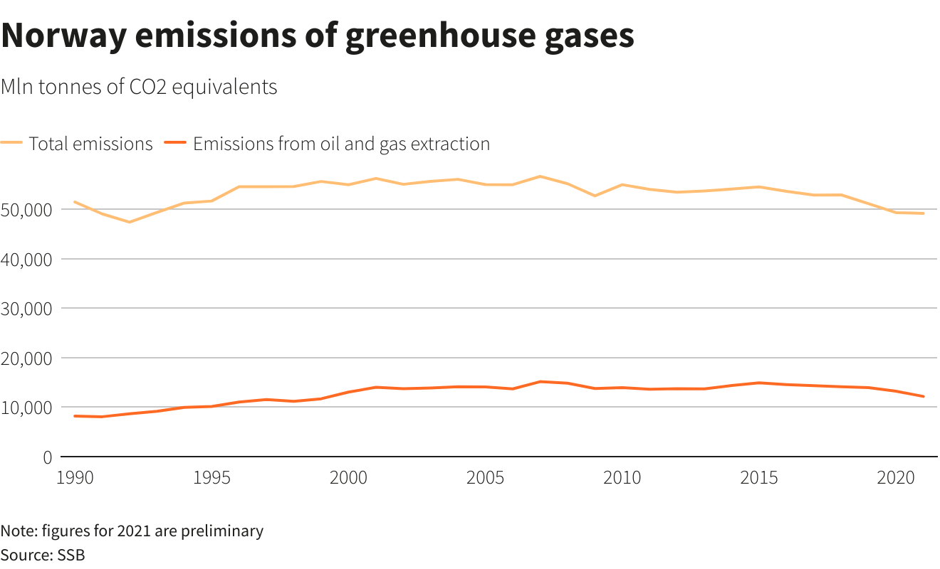Norway, western Europe's largest petroleum producer, aims to reduce its emissions of greenhouse gases by 55% by 2030 from 1990, but as of 2021 the reduction achieved was only 4.5%, preliminary official statistics showed.