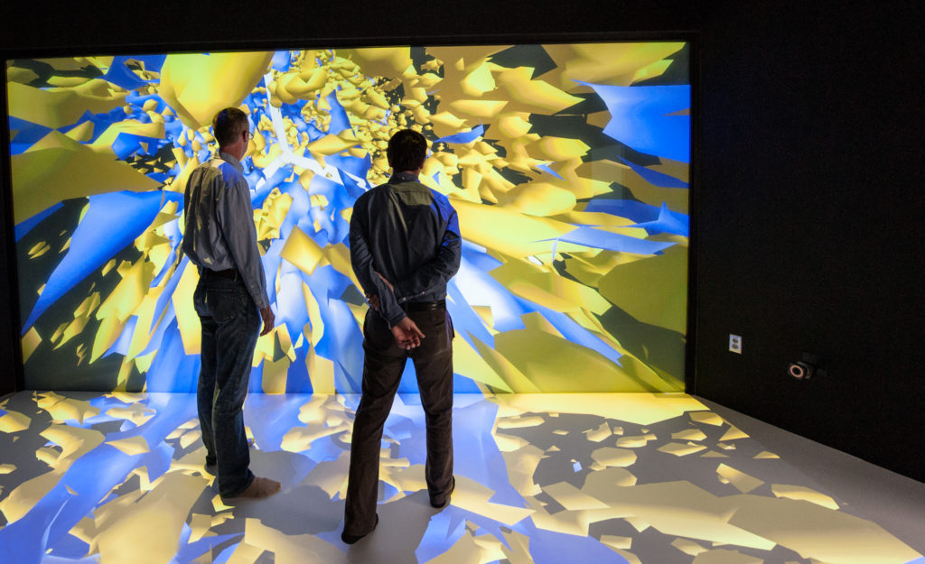 In separate work from 2014, engineers review velocity (blue) and turbulence (yellow) in a simulation of the Lillgrund Wind Farm in Denmark at a visualization lab at the National Renewable Energy Laboratory. Credit: NREL/ Dennis Schroeder.