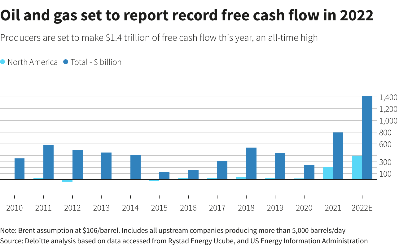 A previous Deloitte study showed energy prices could almost double oil producers' free cash flow this year to $1.4 trillion, giving them money to finance a faster shift to renewable fuels, erase debt or reward investors.