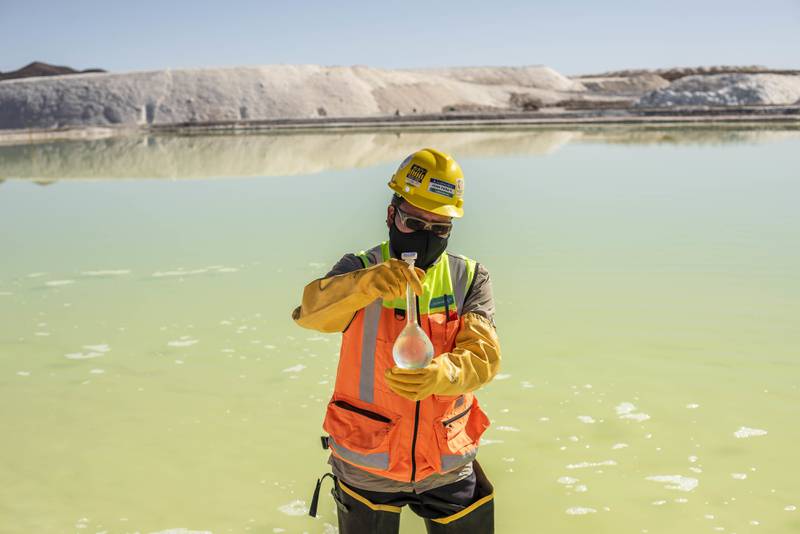 A mine worker takes water samples from a brine pool at the Albemarle lithium mine in Calama. Bloomberg