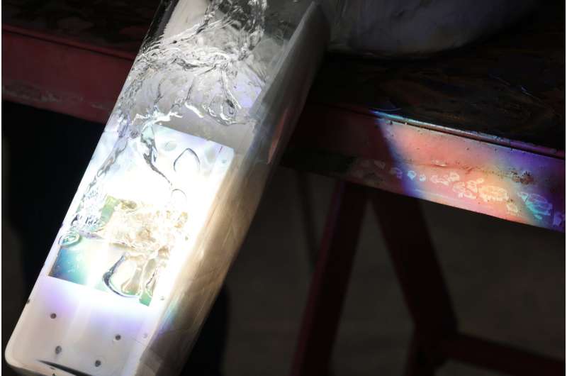 A close-up of the panel with the semiconductor catalyst and water inside. Bubbles of hydrogen and oxygen travel up the slope to be separated in the canister (maybe). Credit: Brenda Ahearn/Michigan Engineering, Communications and Marketing