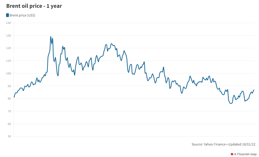 Brent, the benchmark for two thirds of the world’s oil, was trading 1.16 per cent higher at $87.08 a barrel at 2.36pm UAE time on Wednesday. West Texas Intermediate, the gauge that tracks US crude, was up 1.72 per cent to $81.56 a barrel.