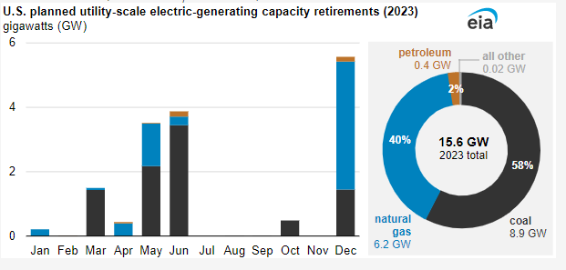 Operators plan to retire 15.6 GW of electric-generating capacity in the United States during 2023, mostly natural gas-fired (6.2 GW) and coal-fired (8.9 GW) power plants, according to the Department of Energy’s Energy Information Administration (EIA).