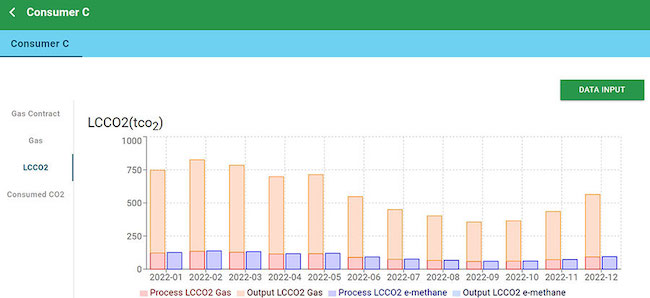 The System has been established as part of the partners' joint project for another PoC that has been underway since October 2022 utilizing CO2NNEX. For the System, the partners have developed a feature that visualizes the amount of CO2 emissions throughout the e-methane lifecycle, from production to transport, supply, and combustion (see Figure 2) and a feature that displays the balance of e-methane environmental value held by each participant and requests/authorizes the trading of the value (see Figure 3).