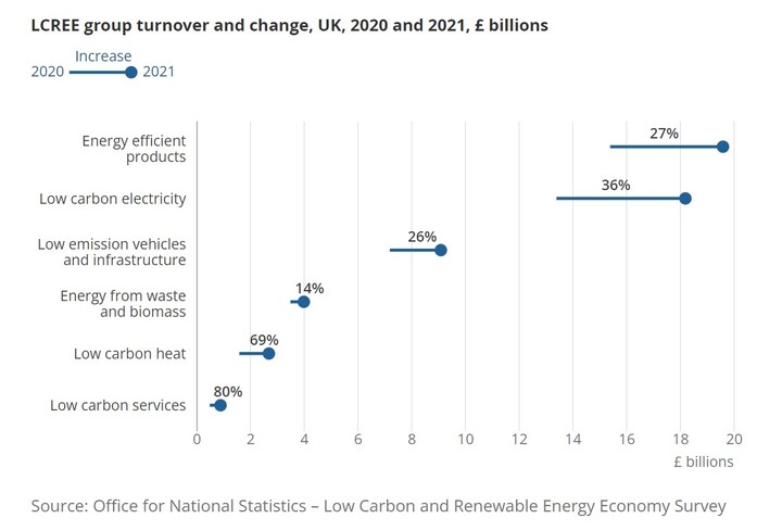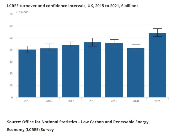 The UK's green economy enjoyed a bumper 2021, according to official new data from the Office for National Statistics (ONS) that confirms both turnover and employment hit their highest level since records began in 2015.