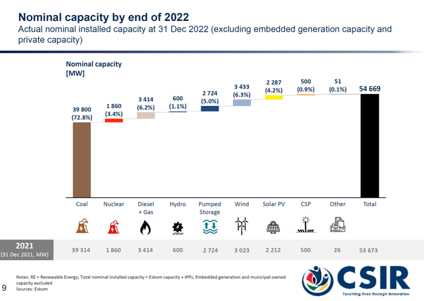 South Africa’s nominal installed capacity increased from 53,673 MW in 2021 to 54,669 MW in 2022 thanks to new capacity from 720 MW of coal, 419 MW of wind, and 75 MW of solar PV that became operational in 2022. Below is a summary of the installed capacity.