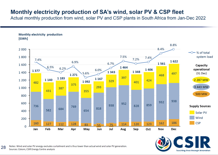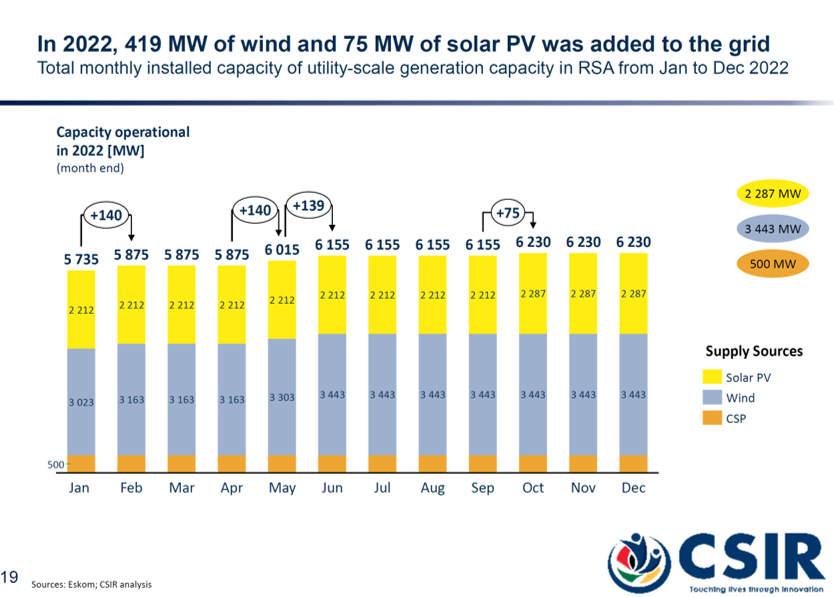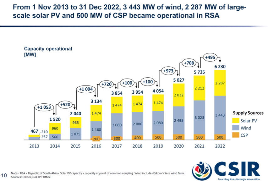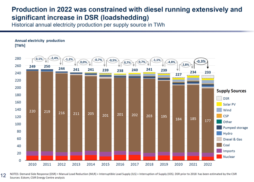 South Africa has been gradually adding utility-scale wind, solar PV, and concentrating solar power (CSP), increasing the installed capacity from 467 MW in 2013 to 6,230 MW as at the end of 2022. However, South Africa’s electricity production has been dropping since 2011, from 250 TWh to 233 TWh in 2022. Eskom plants’ average annual Energy Availability Factor (EAF) dropped to 58.1% in 2022. It had been 66.9% in 2019 and 71.9% in 2018.