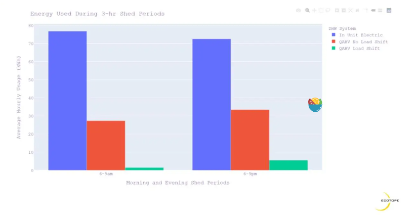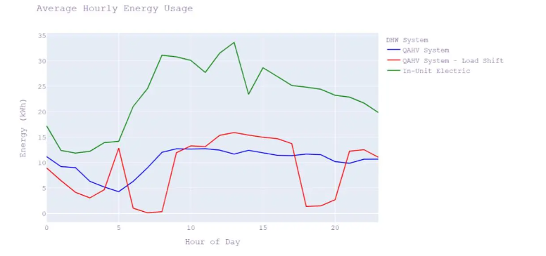 The team working on the Bayview tower project spent the last several months piloting an approach to preheat the water heater hotter than normal during low demand periods, and then turn it off between typical periods of peak usage from 6:00-9:00 AM and PM. And as the chart below indicates, it worked. The blue line shows the baseline heat pump water use without any load shifting. The red line shows how they’ve been able to turn off the system during times of peak demand (while continuing to provide all the hot water necessary) and compares it to what energy usage would look like (green line) with the previous electric resistance water heater.