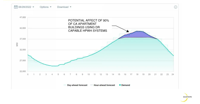 And this represents a tremendous opportunity at a system level. The amount of power capacity that could be saved if nearly all apartment buildings in California were converted to run on load shifting heat pump water heaters is estimated at 2,000 MW. During times of peak demand, cutting 2,000 MW of power could take a significant chunk off the top of the peak energy usage in California (and is actually about as much energy as Californians were able to trim during last summer’s emergency heat wave) – the time when fossil fuel power plants are most likely to be needed. The impact of this shift is shown in the figure below.