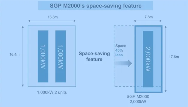 Compared to MHIET's existing 1,000kW gas engine cogeneration system, SGP M2000's electrical efficiency is 1.8 percentage point higher, which means CO2 emission rate involved in power generation is less. It also features compactness. As a result of an extensive effort to increase the engine output, SGP M2000 is able to give twice as much output as MHIET's existing cogeneration system with an engine of the same displacement, which led to reducing the footprint by 40%. The compactness allows the SGP M2000 to be installed in limited spaces such as buildings in urban areas where installation of large facility has conventionally been difficult.