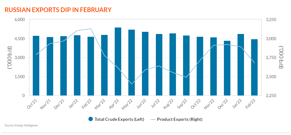 In total, Russia exported 7.14 million barrels per day of crude and products in February, down approximately 600,000 b/d compared with January. A large part of this decline is believed to stem from icy and stormy conditions at key ports, which are now seeing a rebound this month.