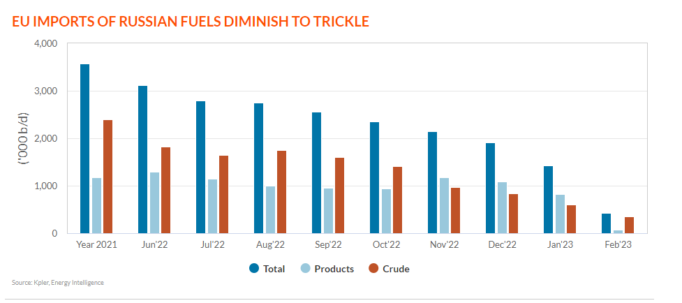 Europe’s aim to rid itself of dependence on Russia’s oil and petroleum products reached full expression in February, at the beginning of which an embargo on the import of products went into effect. Crude has been banned since Dec. 5, although some Druzhba shipments and seaborne deliveries to Bulgaria are exempted.