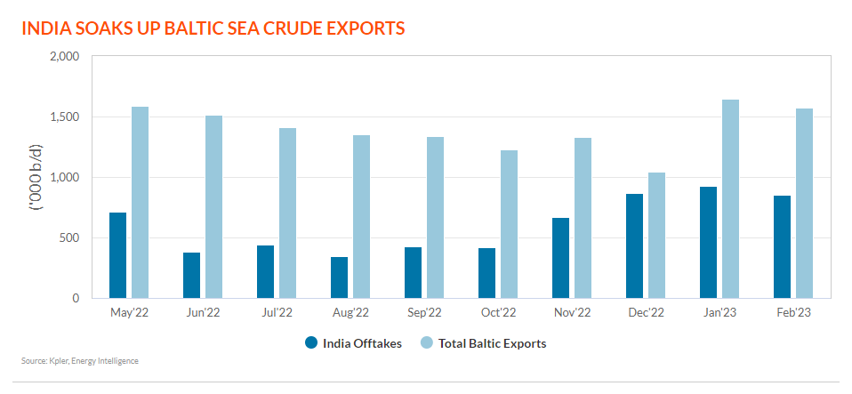 In February, India imported 1.46 million b/d of crude, the largest monthly result yet and the fourth-consecutive month that it has taken more seaborne crude than China. The country is now soaking up the bulk of Urals flows from the Baltic Sea, which is striking considering that it ordered virtually nothing from this distant zone a year ago.