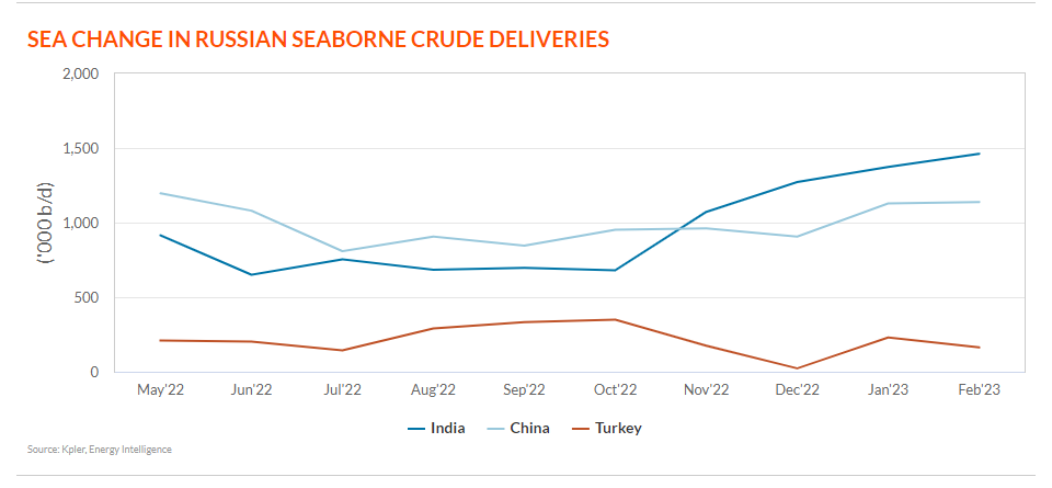 Taken together, China, India and Turkey accounted for 90% of Russia’s seaborne exports in both January and February, according to shipping data.