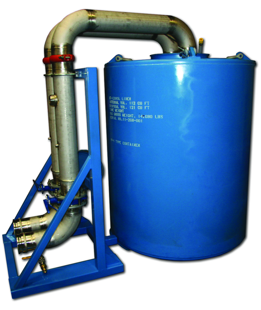 Tank Desludging/Cleaning: Packaging of difficult-to- dewater solids from wastewater and spent resin storage tanks. The SCF™ can be placed in-line downstream of a retrieval system wherein water and solids are transferred into the SCF™, solids are retained on the SCF™’s internals, and clear, low-turbidity water is returned for reuse in additional retrieval operations. Providing clean water for reuse in retrievals minimizes wastewater generation and aids plants in maintaining a zero release operation scenario.