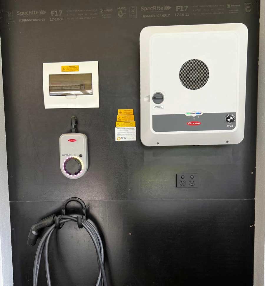 An Australian Wattpilot installation next to a Fronius Gen 24 inverter. The Wattpilot is bottom-left, just above the coiled charging cable. Image: NRG Solar