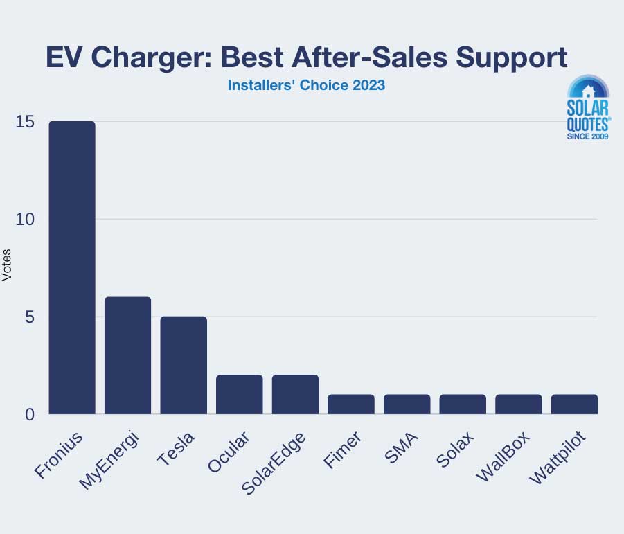 Fronius strikes again, grabbing the top spot for the best after-sales support in Australia. It seems their customer service is as top-notch as their chargers. MyEnergi and Tesla follow, again leaving no room on the podium for the other EV charger manufacturers.