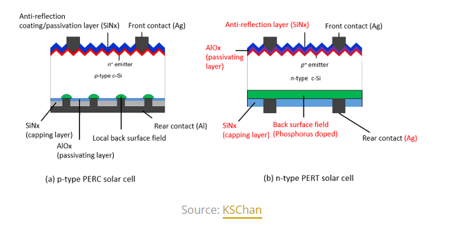 PERT solar cells are manufactured with an n-type crystalline silicon (c-Si) bulk layer because of its higher surface quality and it is coupled with a p+ emitter layer to create the p-n junction. The emitter layer is covered with an aluminum oxide (Al2O3) passivating layer and topped with a silicon nitride (SiNx) coating for its anti-reflecting properties. PERC solar cells replace the absorber layer with a p-type bulk layer and an n+ emitter for the p-n junction.