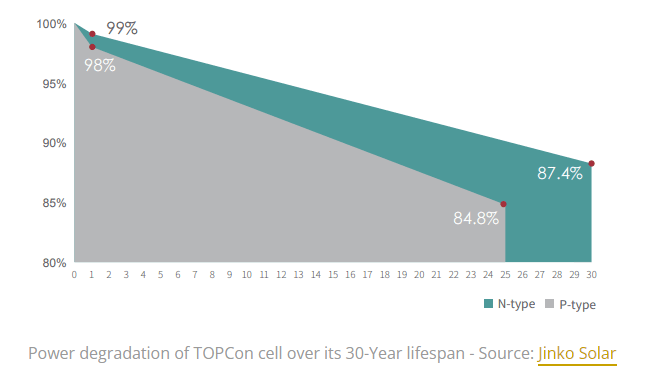 One of the main features of TOPCon solar panels is the higher efficiency achieved. According to the Fraunhofer ISE institute, efficiencies can go beyond 25%. This has already been proved by PV manufacturers like LONGi, Jinko Solar, and others, with a high efficiency of 26.1%.