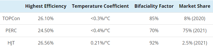 PERC solar cell technology currently sits in the first place, featuring the highest market share in the solar industry at 75%, while HJT solar cell technology started to become adopted in 2019, its market share was only 2.5% by 2021. TOPCon, which is barely present in the market, already represents 8% of the PV market, but it might start to grow in 2023 as major manufacturers switch from PERC/PERT to TOPCon.