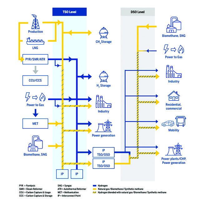 For now, however, gas TSOs and DSOs must manage and accommodate “diversity of technological choices for the benefit and safety of the climate and all consumers while ensuring that achievements of the internal energy market for gas and interoperability between the different energy carriers are maintained and further developed, including hydrogen,” ENTSOG said (Figure 2).