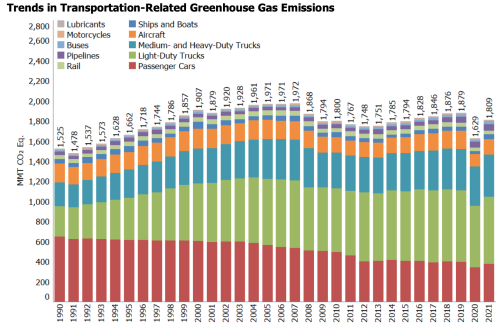 In 2021, light-duty vehicles represented 58% of CO2 emissions from transportation fossil fuel combustion and medium- and heavy-duty trucks and buses represented 25%. The remainder was due to off-road sources.