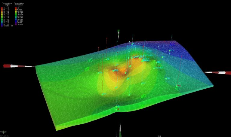 3D temperature distribution model in the reservoir of the Neo Erasmio – Magana geothermal field constructed using the specialized commercial software FEFLOW. The signed Programmatic Agreement between HSGME and NTUA aims, among other things, to build similar models by entering the same data, but with the use of open-source software to facilitate the competent services and reduce the budgetary costs of the management of geothermal fields (Source: HSGME)