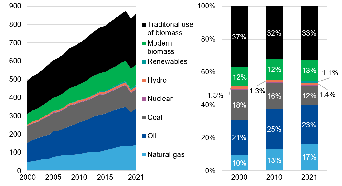 The region’s energy demand relies heavily on traditional biomass (e.g., wood, dung and other solid wastes), primarily for cooking. It is by far the most widely used energy source across Africa, with the exception of South Africa, where the country’s energy mix is dominated by coal, and North Africa, with natural gas and oil accounting for almost 90% of sub-region energy demand. Nevertheless, taking into account expanding African population, some progress has been made in reducing reliance on the inefficient use of traditional sources, as reflected in changing energy mix over the last two decades.