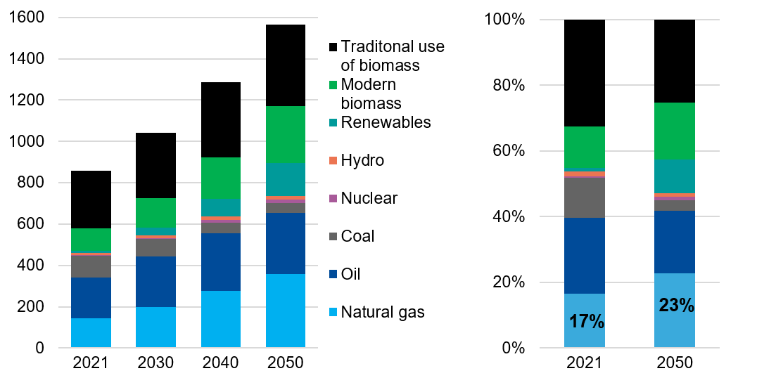 With the total energy demand rising significantly from 495 Mtoe in 2000 to 860 Mtoe in 2021, the share of traditional biomass in the African energy mix dropped from 37% to 33%. Despite its rise in absolute terms, there was observed a shift to modern biomass along with accelerated penetration of natural gas and oil, driven by strong electrification, industrial development, increasing vehicle fleet and the uptake of piped gas and LPG within households. Natural gas specifically contributed 26% to Africa’s energy demand growth between 2000 and 2021.