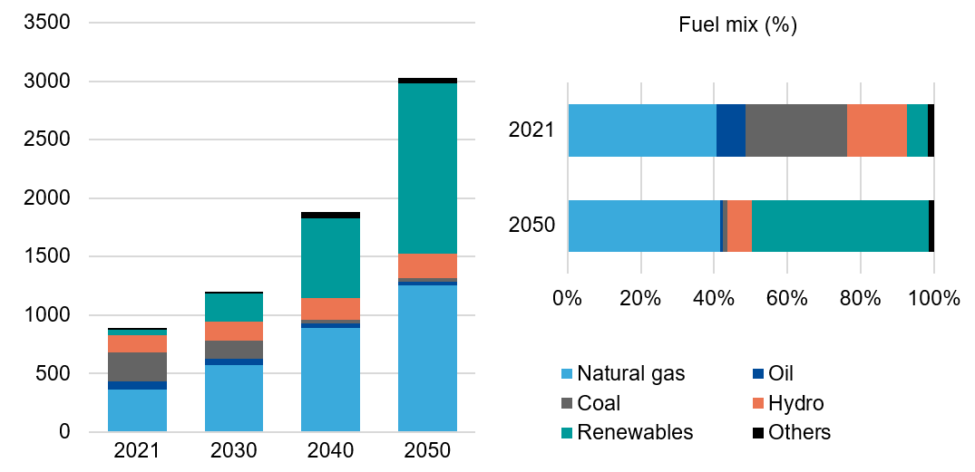 According to GECF estimations, electricity generation in Africa will surge from 890 TWh in 2021 to 3,025 TWh in 2050 (Figure 6). Natural gas is forecast to cover more than 40% of the total growth and account for 42% of the regional power generation mix by 2050. In this regard, natural gas, in tandem with renewables (which will grow rapidly, underpinned by countries’ plans and supporting programmes and initiatives), will become essential in improving electricity access.