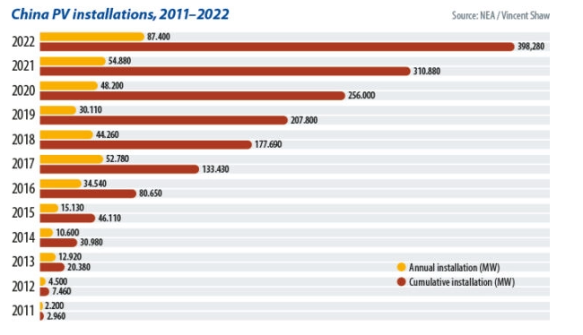 China is set to become the first country to install 100 GW(AC) of solar in a year. It is the world’s biggest solar market and exporter of most of the world’s PV wafers, cells, and modules. China’s photovoltaic industry has been 20 years in development and has rocketed in the last decade to include exports of PV production equipment and process know-how.