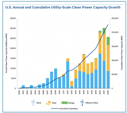 Third-Largest Year: 25.5 GW of new clean power was commissioned in 2022, making it the third-largest year on record and bringing the total amount of American clean power online by year’s end to nearly 228 GW.
