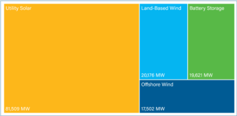 In the nearly 140 GW development pipeline, solar accounts for 59% of all clean power capacity. Land-based wind accounts for 15% of the pipeline, battery storage represents 14%, and offshore wind claims the remaining 13%.