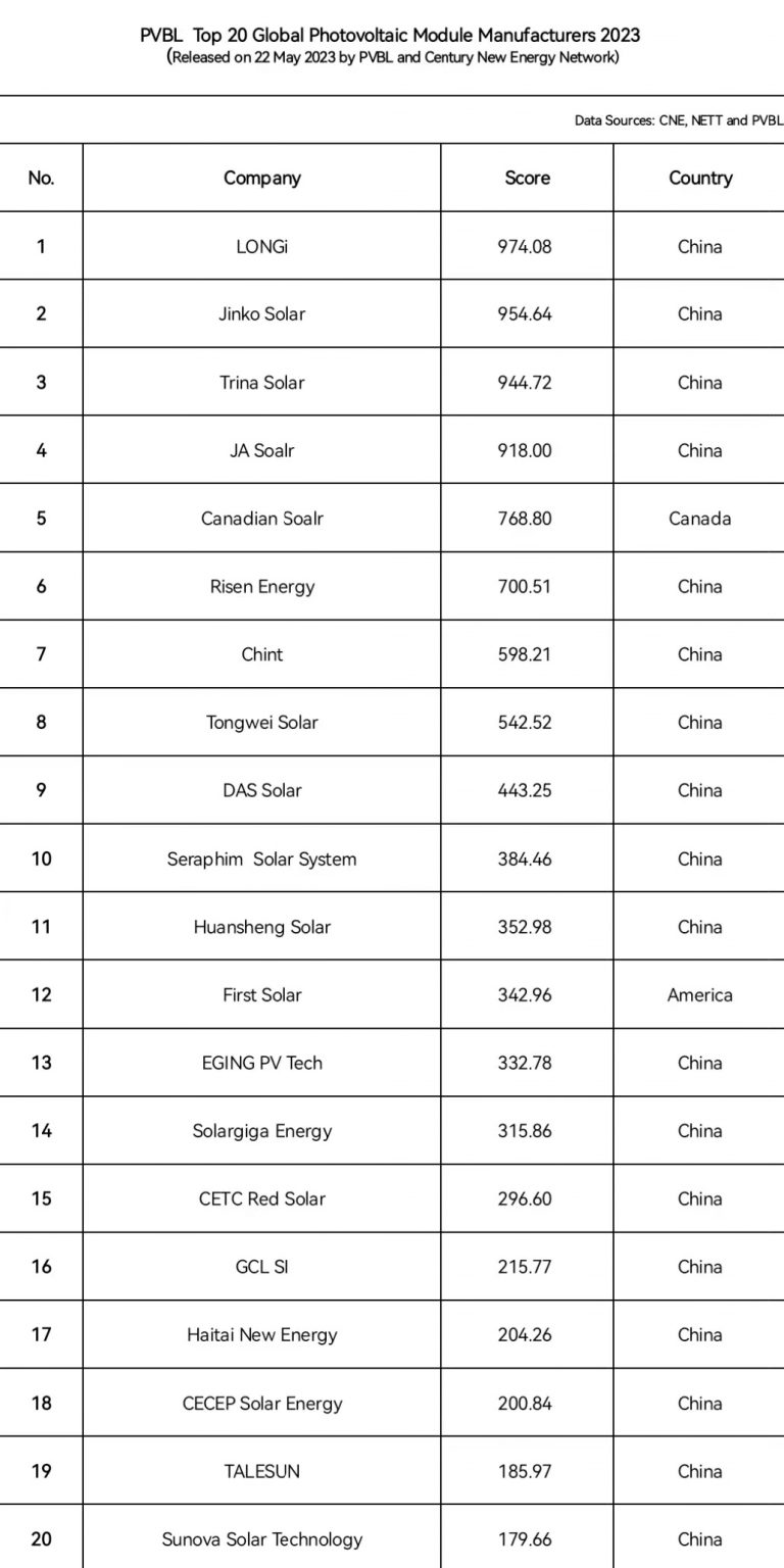 The major players maintained their leading positions throughout the list. The top four were LONGi, Jinko, Trina and JA Solar, the same order as previous year. Canadian Solar, Risen Solar, Chint, Tongwei, DAS Solar and Seraphim were among the top five to ten.